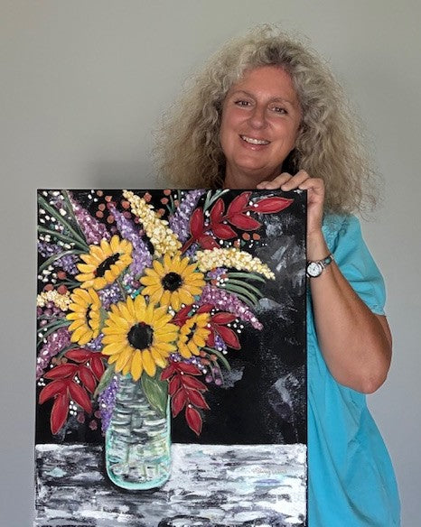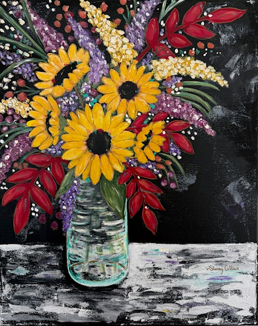 This original, acrylic painting on 16" x 20" canvas, is ready to hang as is. Bouquet of Autumn Radiance captures the golden warmth of sunflowers and the fiery flow of all leaves inspired by childhood memories of gathering autumn foliage and harvesting sunflowers in Michigan gardens. The Bible verse, Joel 2:23 comes to mind. This painting is perfect for adorning your walls in autumn or year-round.