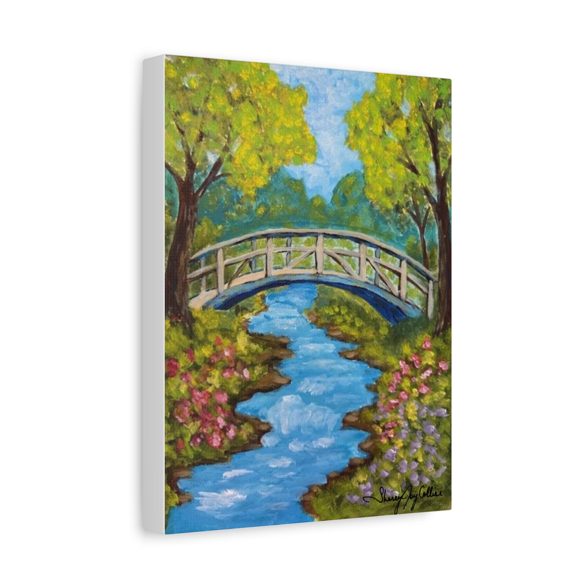 Step into a peaceful garden scene where a gentle stream winds its way beneath a graceful wooden bridge. Surrounded by lush greenery and colorful blooms, this painting invites you to pause, breathe, and cross into a place of calm. The vibrant blues and fresh greens create a soothing atmosphere that uplifts any room.