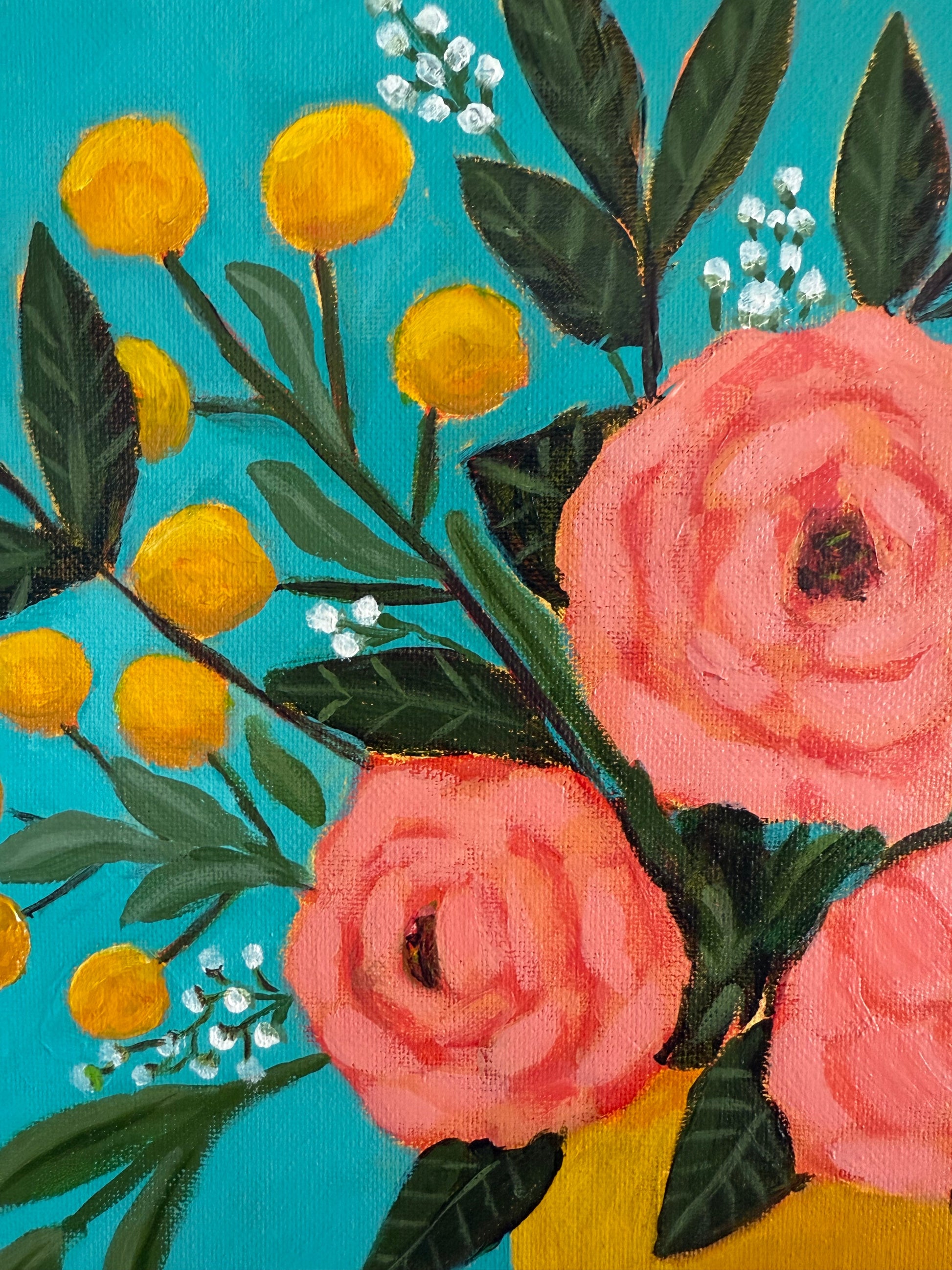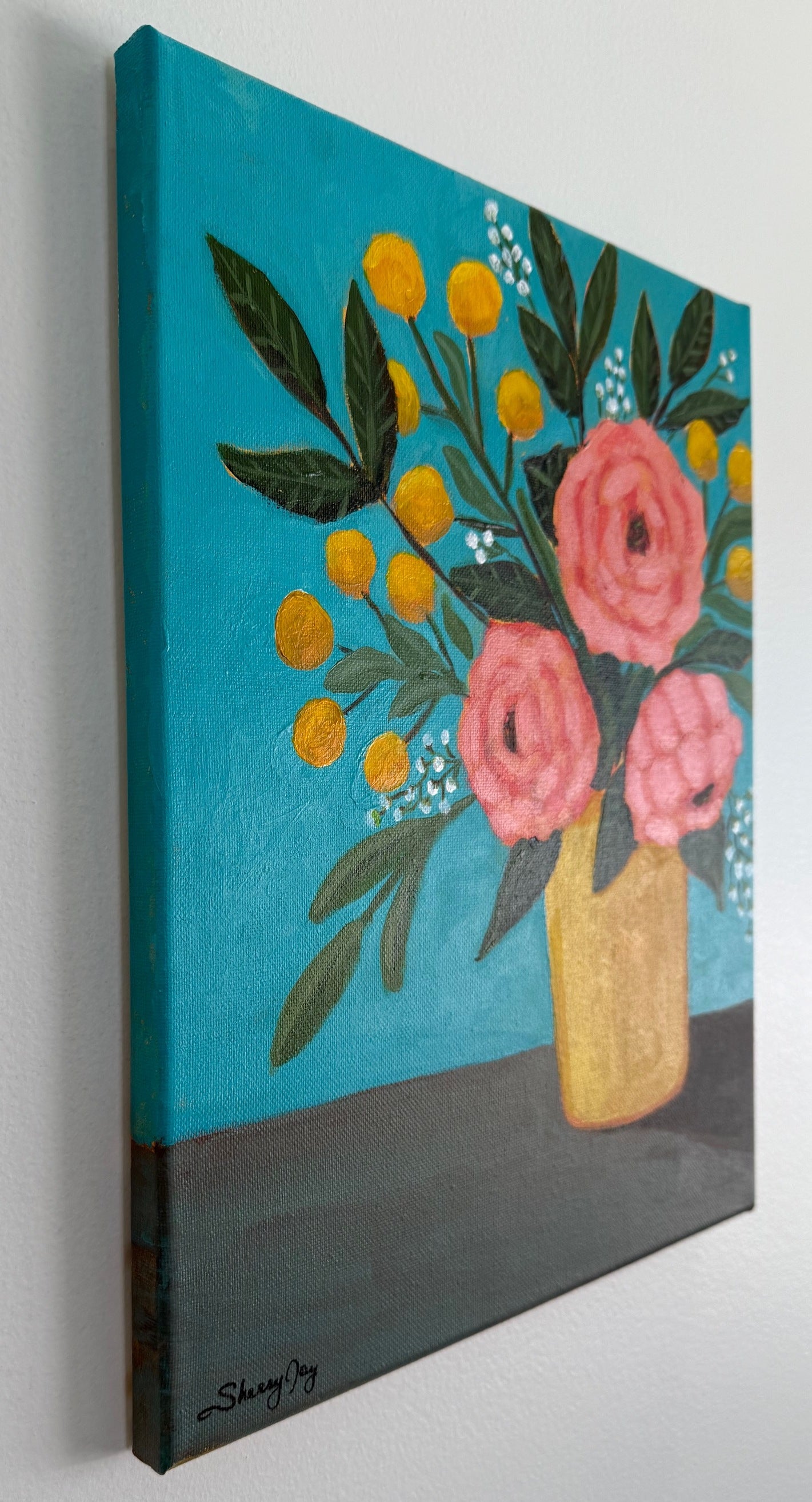 This bright and cheerful floral arrangement radiates warmth and grace. Featuring coral blooms, sunny yellow billy buttons, and delicate white accents, all gathered in a golden vase, the painting captures a moment of beauty that feels both joyful and serene. Set against a vibrant turquoise background, this piece is a reminder that even in simple things, God’s grace overflows.
