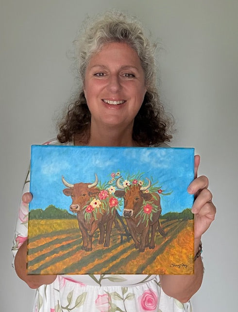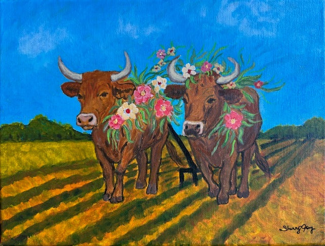 Original, acrylic on 9" x 12" canvas, by Sherry Joy. Inspired by Matthew 11:28-30, this painting of yoked oxen adorned with flowers reflects Jesus' words, "Come to me, all you who are weary and burdened, and I will give you rest. Take my yoke upon you and learn from me, for I am gentle and humble in heart, and you will find rest for your souls. For my yoke is easy and my burden is light." The flowers symbolize His easy yoke and light burden, while the warm colors convey the incredible love of Jesus.