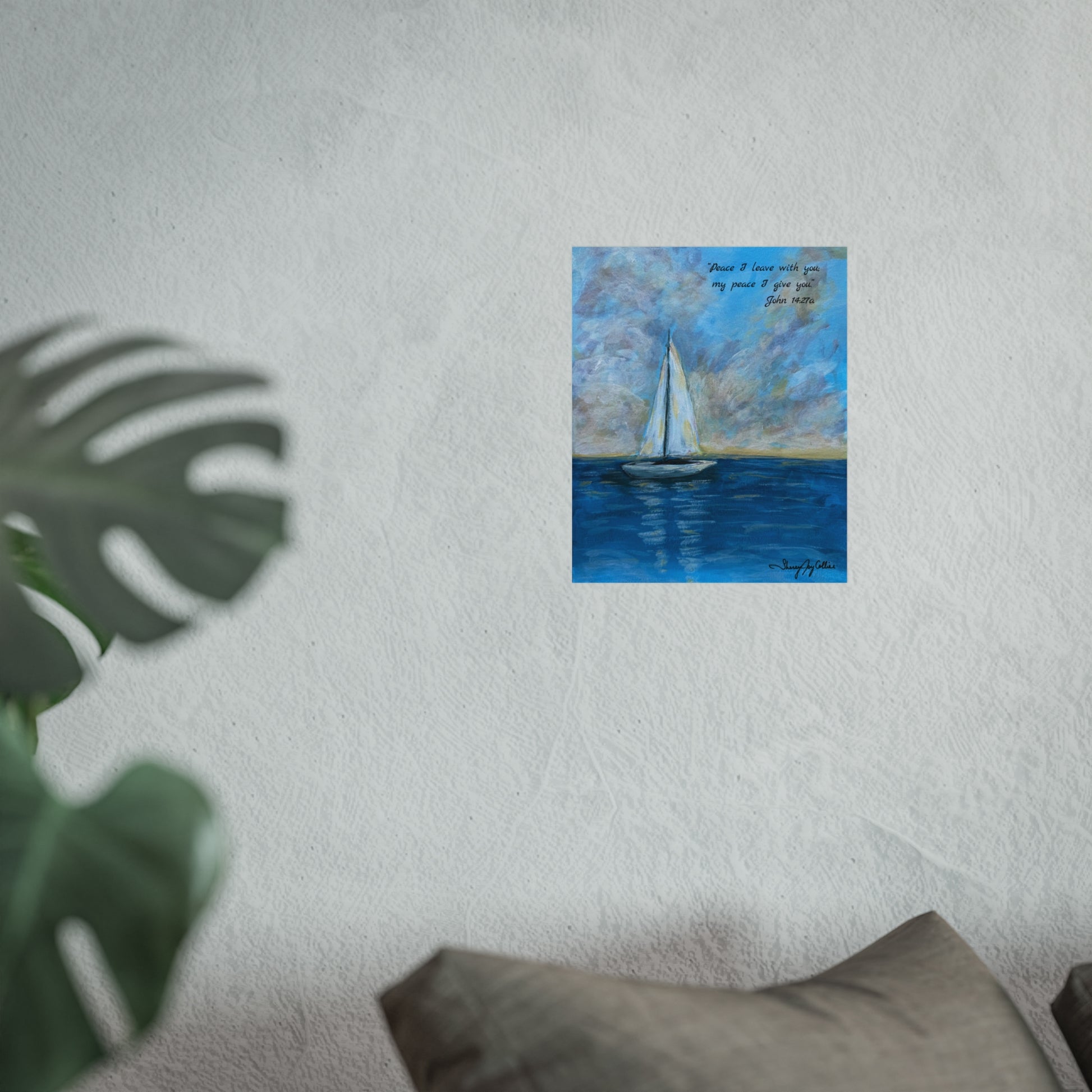 A calm, gallery-quality fine art poster that brings the open sea into a quiet room. Soft brushstrokes of cerulean and sky blue form a lone sailboat gliding across reflective water, while a gentle scripture text sits in the clouds. The matte, giclée print on thick 220 gsm paper gives subtle texture without glare, so the blues and neutrals feel warm and lived-in on the wall. Choose from three sizes to anchor a reading nook, brighten a hallway, or add serenity above a bedside table. This piece invites slow breaths and peaceful pauses — a small, everyday reminder of calm waters and steady horizons. Artwork by Sherry Joy Art