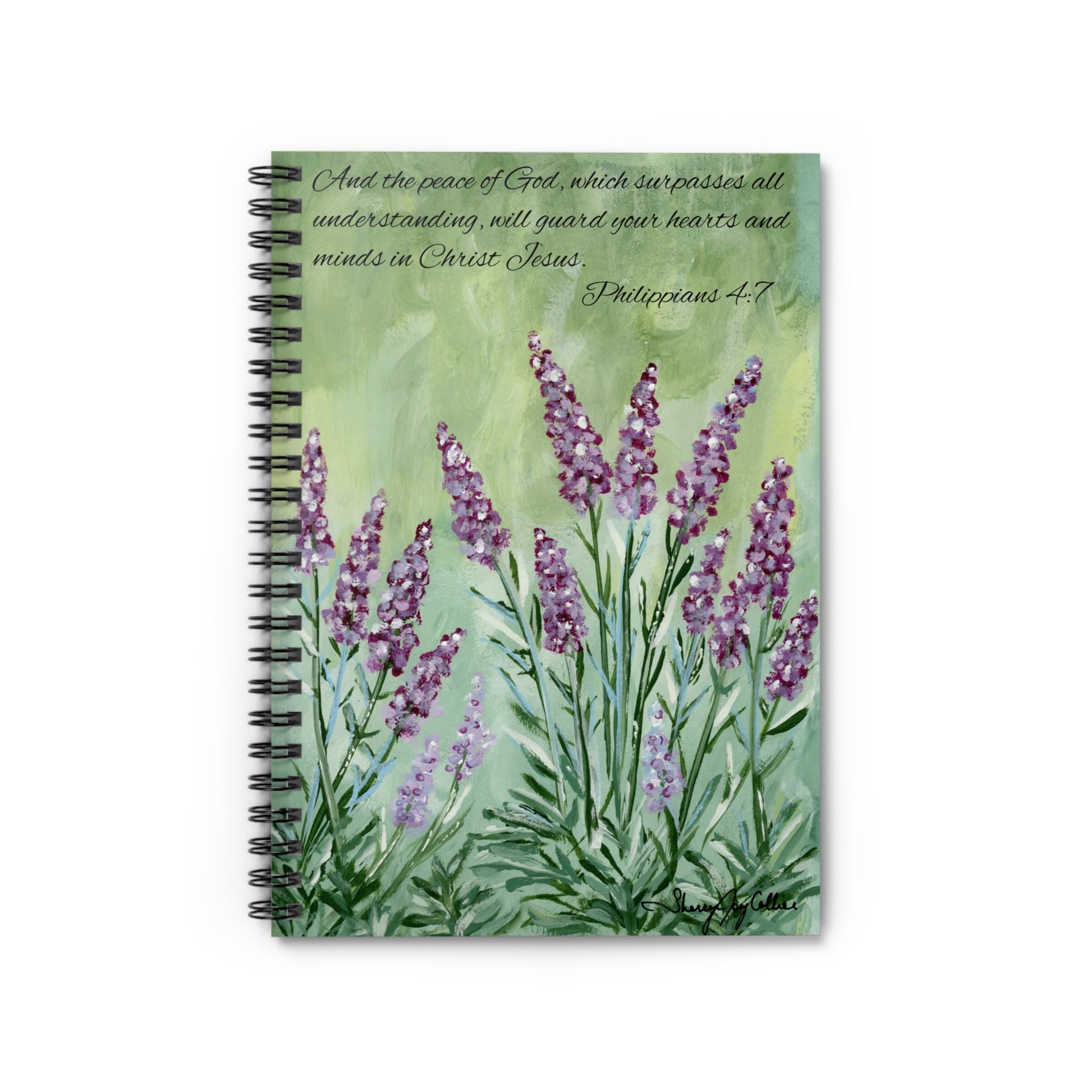 Philippians 4:7 and Soothing Lavender cover on this journal for Bible verses, letters to God, prayers from the heart or poems - 118 page spiral notebook with ruled line paper is a perfect journal for everyday life. The durable printed cover with original art by Sherry Joy Collier, encourages the owner to pray and write. Do not duplicate or copy without permission from the artist.